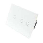 White Glass Panel LED WIFI RF On/Off Touch Light Switches: These switches can turn the lights on/off and are operated by Touch. These switches are LED compatible as well as all Halogen bulbs and fittings. In addition, the Switch has a blue backlight for each Gang, making it visible in the dark making it easier to find your switch at night.