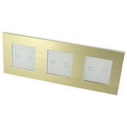 Gold Brushed Aluminium LED Remote Dimmer Touch Light Switches: These switches can turn the lights on/off and are operated by Touch. These switches are LED compatible as well as all Halogen bulbs and fittings. In addition, the Switch has a blue backlight for each Gang, making it visible in the dark making it easier to find your switch at night.