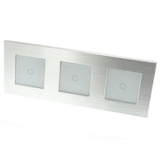 Silver Brushed Aluminium Frame LED Remote On/Off Touch Light Switches: These switches can turn the lights on/off and are operated by Touch. These switches are LED compatible as well as all Halogen bulbs and fittings. In addition, the Switch has a blue backlight for each Gang, making it visible in the dark making it easier to find your switch at night.
