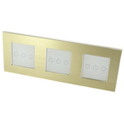 Gold Brushed Aluminium Frame LED On/Off Touch Light Switches: These switches can turn the lights on/off and are operated by Touch. These switches are LED compatible as well as all Halogen bulbs and fittings. In addition, the Switch has a blue backlight for each Gang, making it visible in the dark making it easier to find your switch at night.